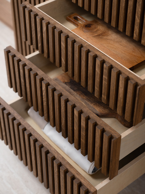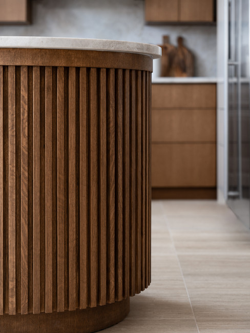 The kitchen features cabinets made from solid rift-cut oak, elegantly stained with a walnut finish. These are beautifully complemented by a natural quartzite Taj Mahal countertop. Throughout the space, brass accents add a touch of warmth, enhancing the natural elements of stone and wood. The standout feature is the slatted curved peninsula, both visually striking and incredibly functional for our clients' needs.